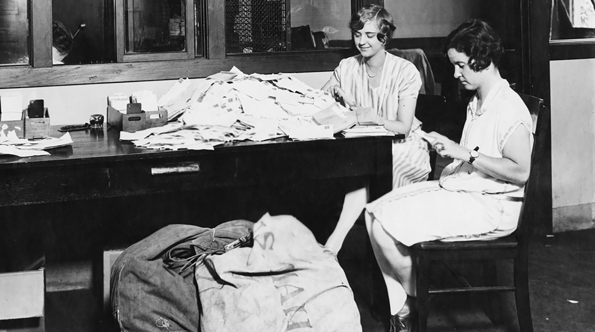 University secretarial staff sort through the mail, undated photo. (UChicago Photographic Archive, apf1-05561, Hanna Holborn Gray Special Collections Research Center, University of Chicago Library)